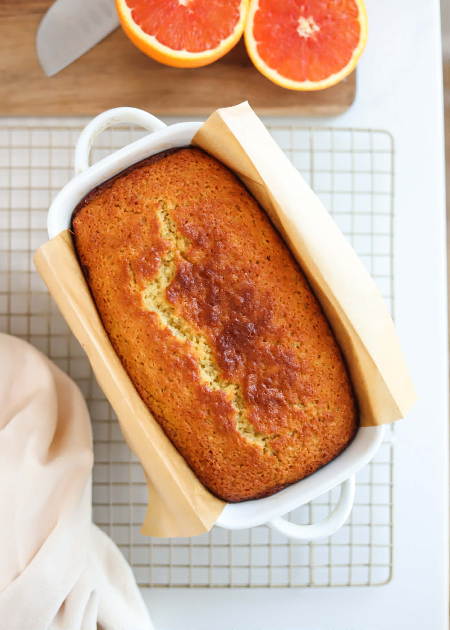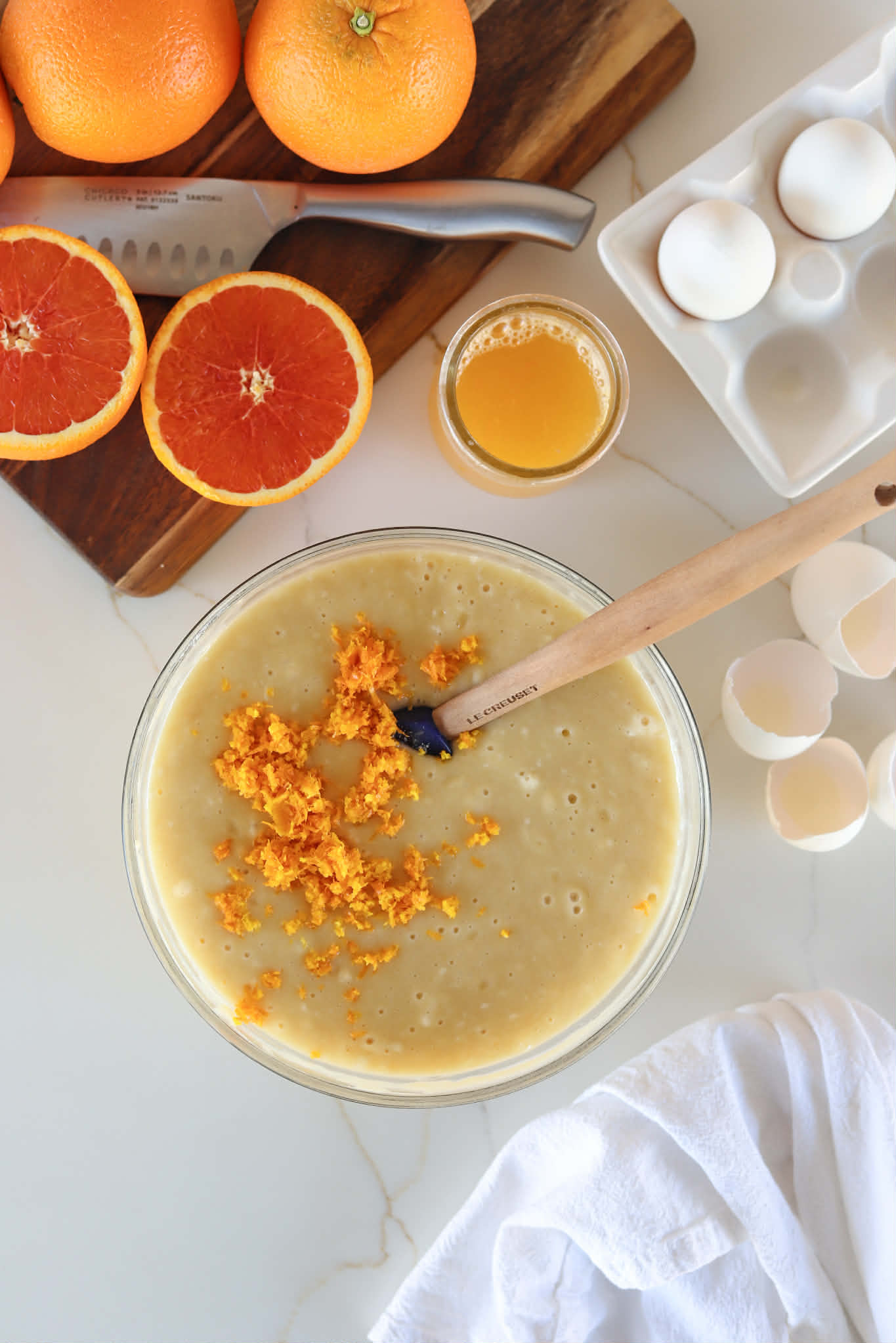 If you want a citrus flavored yogurt cake, add 1/2 container of freshly squeezed citrus juice and about a tablespoon of the zest. Mix until the citrus is well incorporated and transfer the batter into a greased and parchment lined loaf pan.
