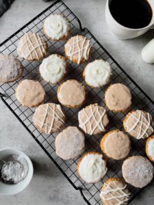 If you want a little variety in your cookie spread, do a little bit of everything! Today, I topped some of my cookies with the spiced frosting, some in melted white chocolate and some in a vanilla glaze. I drizzled a little extra white chocolate over some of them and dusted a few with extra confectioners sugar.