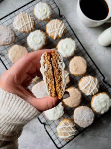 Whatever you decide to frost these cookies with, one thing is for sure, you are going to love their warmly spiced flavor, crispy edges and wonderfully chewy centers. They have all of the comforting flavors of a classic oatmeal cookie complimented by a combination of cinnamon, ginger, all spice, nutmeg and cloves. It is such a delicious spice blend that really pushes these cookies to the next level.
