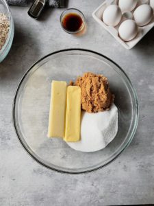 • In a large bowl, beat 1 cup of room temperature butter with 3/4 cup of granulated sugar and 3/4 cup of brown sugar until fully combined