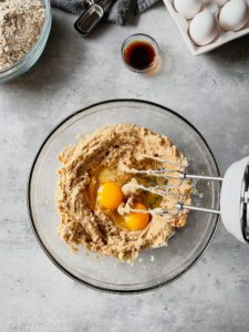 In a separate bowl, beat together 1 cup (2 sticks) of room temperature butter with 3/4 cup of granulated sugar and 3/4 cup of brown sugar until fully combined. You can use an electric hand mixer, stand mixer or a stiff whisk to bring this dough together.