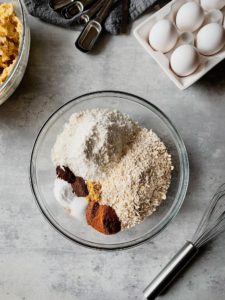 Transfer 2 1/2 cups of the pulsed oats into a large bowl along with 1 1/2 cups of bread flour, 1 teaspoon of baking soda, 1 teaspoon of salt, 1 1/2 teaspoons of ground cinnamon, 1/2 teaspoon of all spice, 1/2 teaspoon of ground ginger, 1/4 teaspoon of nutmeg and 1/4 teaspoon of cloves. Whisk everything to combine and set this bowl aside for now.