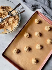 This cookie dough is a little sticky, so I recommend spraying a tablespoon cookie dough scoop with non-stick spray and use this to transfer equal portions of dough onto parchment paper lined baking sheets about 2 inches apart. I love using this method, because it is quick, clean and results in a batch of cookies that are all the same size and shape.