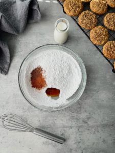 • Once the cookies are all baked and cooled, make the frosting by sifting 2 cups of confectioners sugar into a bowl and adding 1/2 teaspoon of ground cinnamon, 1/4 teaspoon of all spice, 1/2 teaspoon of vanilla extract and enough milk to create a thick, but smooth frosting texture
