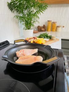 Place a large oven safe skillet over medium heat and add a splash of olive oil. While the skillet is warming up, preheat your oven to 400 degrees. We are just searing the chicken on the stovetop to ensure that the outside forms a bit of a crust, which will make sure that the interior stays nice and juicy.