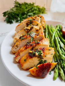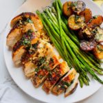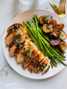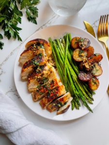 This healthy and flavorful dinner for two is perfect for everything from a simple weeknight dinner to a cozy date night at home. Pan seared chicken and baby potatoes are basted in a garlic and lemon butter sauce and then roasted to caramelized perfection…