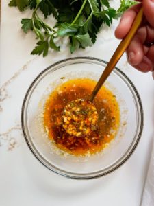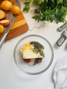 - In a small dish, combine 4 tablespoons of melted butter with a tablespoon of parsley, 1/2 teaspoon of paprika, 1/2 teaspoon of cumin, 3 cloves of finely minced garlic and about 2 tablespoons of lemon juice