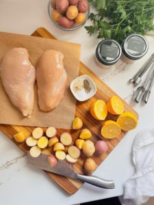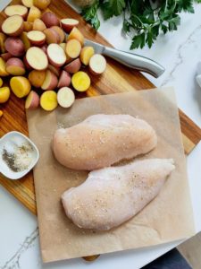 Begin by gathering 2 boneless skinless chicken breasts and 10 ounces of baby potatoes. You can use baby new potatoes, little red potatoes or a gemstone medley.