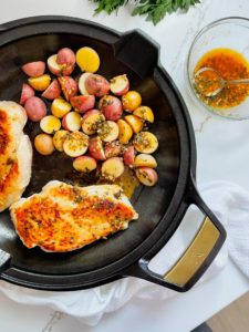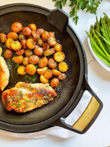 Roast the chicken and potatoes for 25-35 minutes or until the chicken is cooked through with an internal temperature of 165 degrees and the potatoes are fork tender. Mix the potatoes around a bit as they roast to both give them all time on the bottom of the skillet and to re-coat them in the garlic butter a few times as they roast.