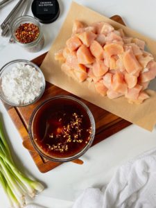 To get started, cut 2 pounds of boneless skinless chicken thighs or breasts into 1 inch cubes and gather 1/2 cup of cornstarch, 2/3 cup of canola or vegetable oil, 2 tablespoons of crushed garlic, 2 tablespoons of crushed ginger, 1/3 cup of brown sugar, 1 teaspoon of red chili flakes, 1/2 cup of soy sauce, 1/3 cup of rice vinegar and 1/3 cup of hoisin sauce.