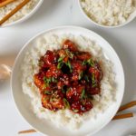 Add some rice into the base of your favorite bowl and top it with your General Tso’s chicken. Be sure to spoon a little extra sauce over everything and then garnish with some white sesame seeds and thinly sliced spring onions.