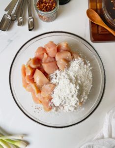 Start by combining the cubed chicken with 1/3 cup of cornstarch in a large bowl (set the remaining cornstarch aside for the sauce). Toss until chicken is fully coated in cornstarch.