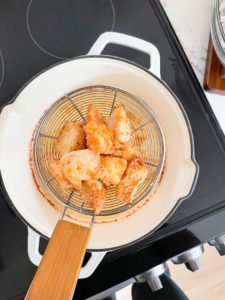 Be careful not to crowd the chicken, it took me 3 batches to fry up 2 pounds of chicken and this left me with nice, crisp chicken. If you add too much of the chicken in at one time, it will lower the temperature of the cooking oil and will result in soggy chicken.