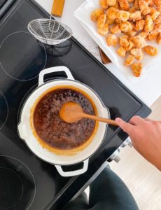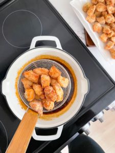 Toss the crispy coated chicken in that beautifully sweet and sticky sauce and let it simmer over medium heat for a few more minutes. This will give the chicken time to reheat and that sauce to get even better…