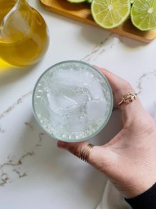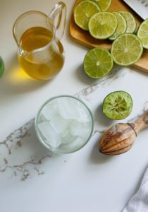 Now that you have your ginger simple syrup all ready to go, fill your glasses half way with some ice and add 2 tablespoons of fresh lime juice.
