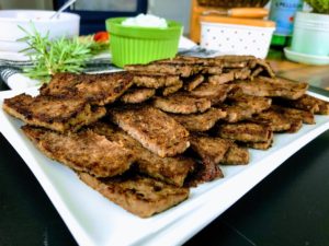 Unwrap the meat and cut it into 1/4 inch slices. I like to cut these slices in half sometimes to make thinner pieces, but you can make them any size you prefer.