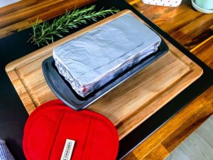 Place a foil wrapped brick directly onto the meat and let it sit for 20 minutes. As it cools, the weight of the brick will compact the meat, both improving the texture and making it easier to slice thin later on. I bet you never thought you would need a brick in the kitchen…