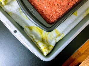 While you are layering the meat into the loaf pan, preheat your oven to 325 degrees and bring a pot of water to a rolling boil. Place a large kitchen towel into a 9″x13″ cake pan and set the loaf pan over top of the towel.