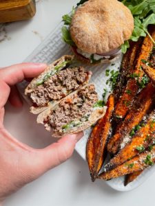 Our patties are made with ground lamb seasoned with garlic, red onions and fresh herbs and they are served in mini pitas topped with tzatziki sauce, tomatoes, red onions and feta. These sliders are small, but the flavors are big and if you love those inviting mediterranean flavors then you are going to love these greek lamb pita sliders.