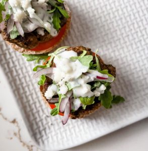 Top the lamb with a little arugula and some red onion and then give the sliders another drizzle of tzatziki and finish everything off with crumbled feta…