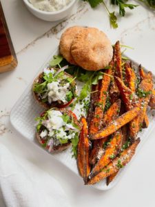 To assemble your sliders, you will need 8 mini pitas, some tzatziki sauce, a small thinly sliced tomato, some thinly sliced red onion, baby arugula and some crumbled feta cheese. If you are not a fan of one of these toppings, feel free to leave them out!