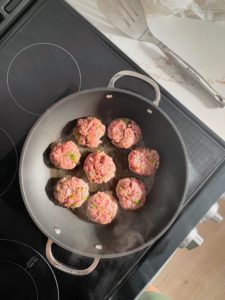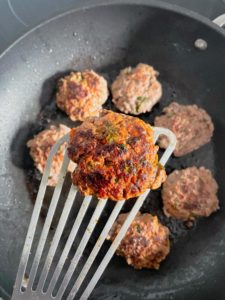 Once the skillet is nicely warm, add a few tablespoons of olive oil and add the patties. Let them cook for at least 2-3 minutes on the first side without shifting them. This will give them time to form a nice golden brown crust before you flip them.