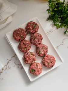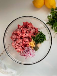 Begin by combining 16 ounces of ground lamb with 1/4 cup of finely grated red onion, 2 cloves of finely grated garlic, 2 tablespoons of finely chopped parsley, 1 tablespoon of freshly squeezed lemon juice, 1/2 teaspoon of salt, 1/2 teaspoon of ground coriander and 1/4 teaspoon of black pepper in a large bowl.