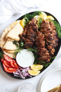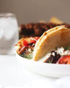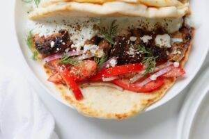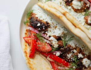 To assemble, pull some souvlaki off of a skewer and place it onto a fluffy pita. Nestle some thinly sliced tomatoes and red onions next to the souvlaki and spoon some tzatziki over everything. Crumble some feta over top and if you haven’t seasoned your tomatoes and onion yet, be sure to add a pinch of sea salt and black pepper.