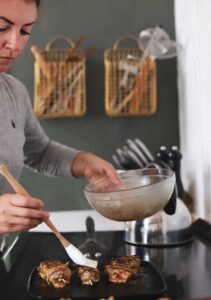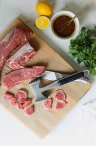 Cut the tenderlion in half lengthwise and then slice little medallions that are about 1 inch wide and 1/2 in thick out of each strip. Use the texturized side of a meat tenderizer to pound each piece once. We aren’t trying to make the pieces super thin, but we do need to pop a few holes into each piece to allow the maximum amount of marinade to be incorporated.