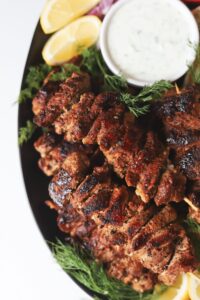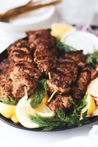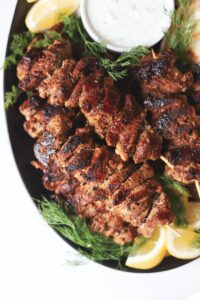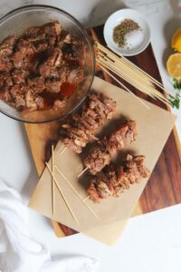 Grill the skewers for 3-4 minutes per side brushing with the leftover marinade before flipping. The souvlaki is done when all sides are caramelized and the internal temperature reaches 145 degrees.