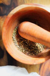 The spice blend we are creating is best made using a mortar and pestle with whole peppercorns and coarse sea salt, but if you do not have one, we can work around this step.