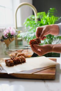 - If you are using bamboo skewers, soak them in water for 30 minutes so they don’t burn.