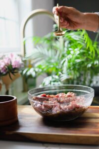 Transfer all of the pork into a large bowl and set it aside while we create the marinade…