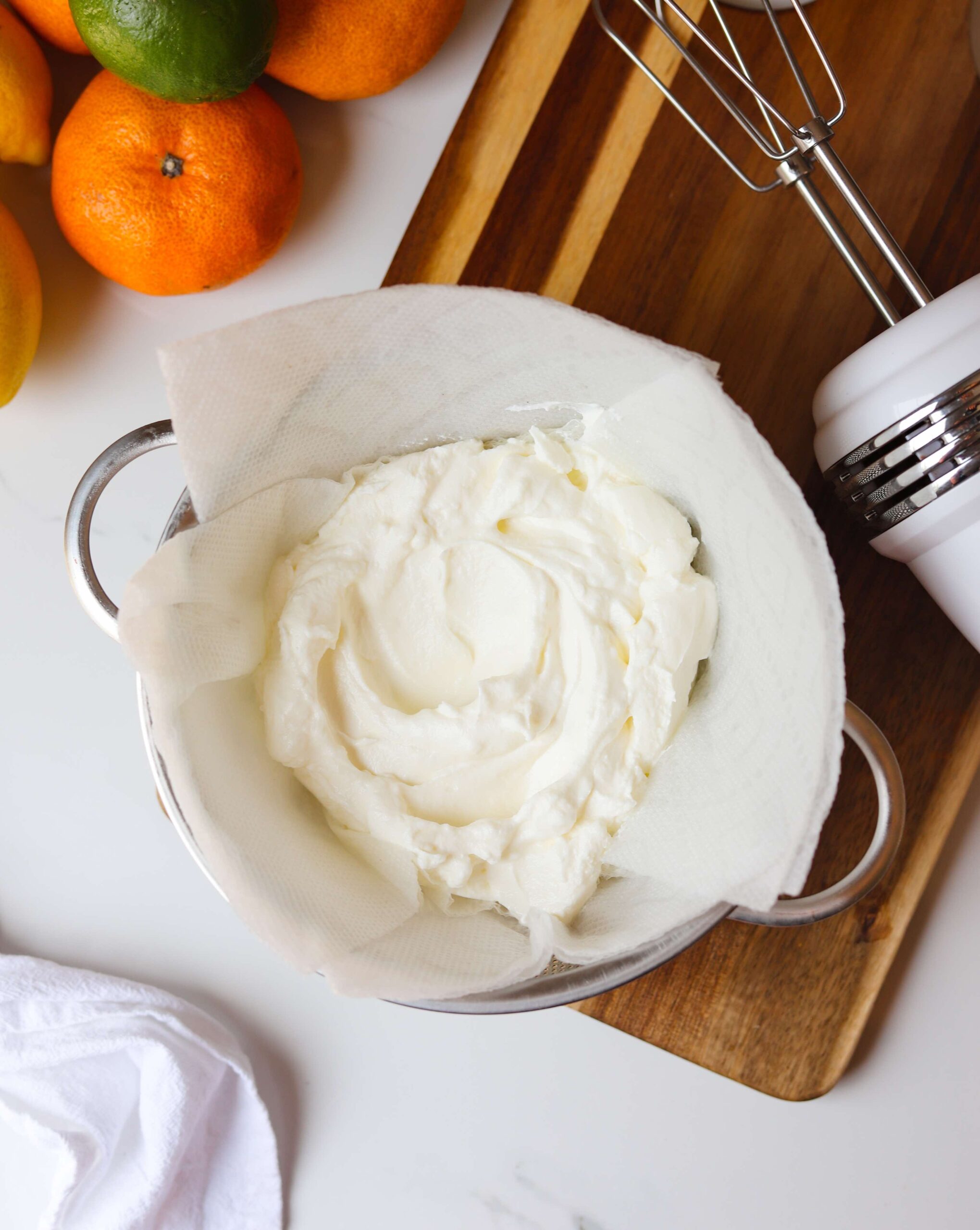 To remove this excess liquid, add 2 cups of plain greek yogurt into a mesh strainer lined with paper towels. Place the strainer over a bowl and let it sit in your refrigerator overnight. The next day, you will be left with the perfect yogurt to make frosting with.