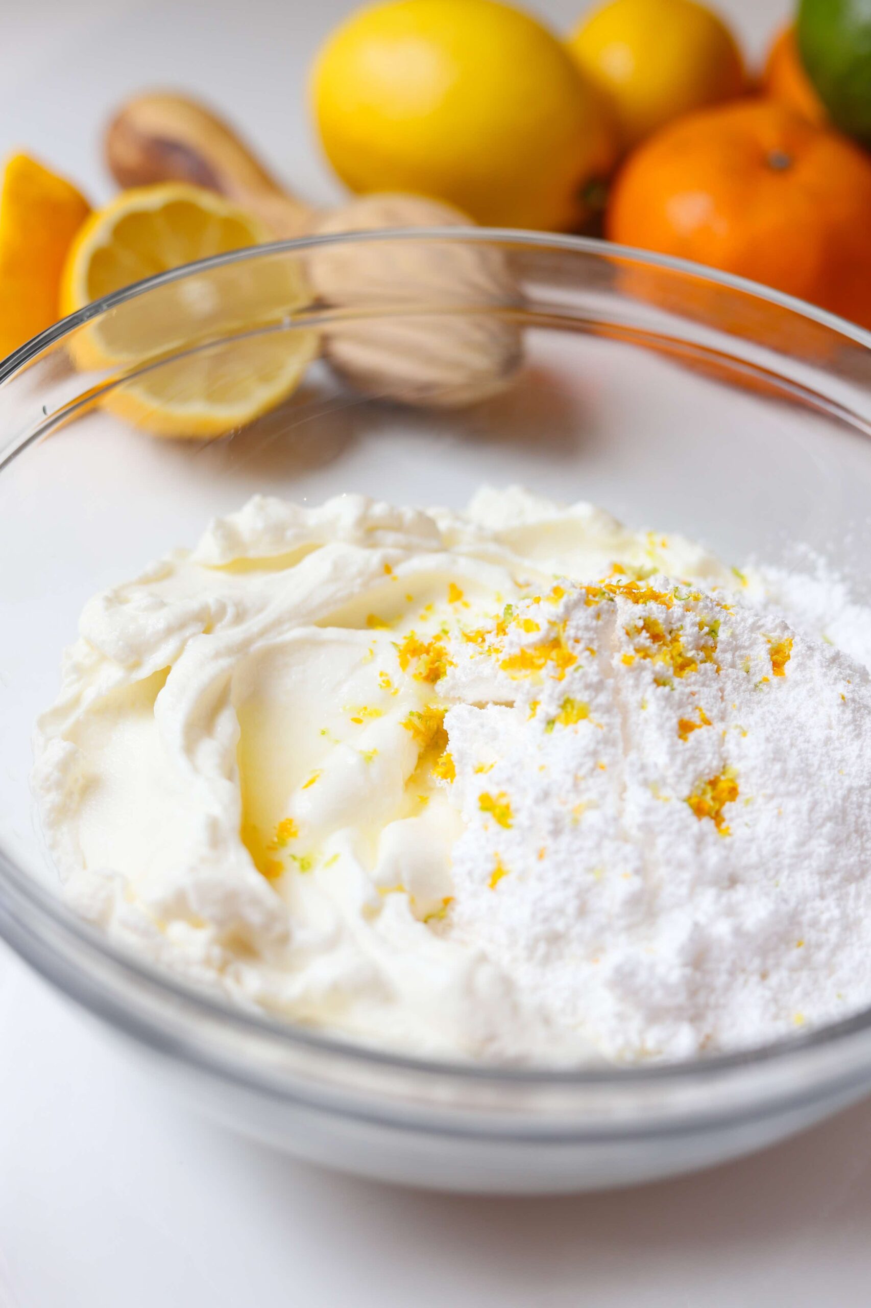 - Transfer the drained Greek yogurt into a large bowl along with 2/3 cup of confectioners sugar, 1 tablespoon of fresh citrus juice and some optional citrus zest and vanilla extract