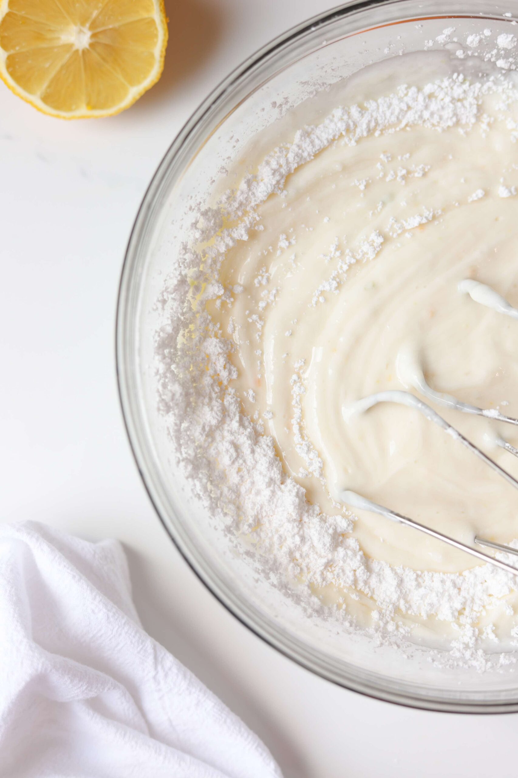 Add the strained yogurt into a bowl and add 2/3 cup of confectioners sugar (use powdered monkfruit as a sugar alternative!) and 1 tablespoon of fresh citrus juice of your choice. I also like to zest the citrus that I am juicing into the frosting for an even bigger punch of citrus flavor.