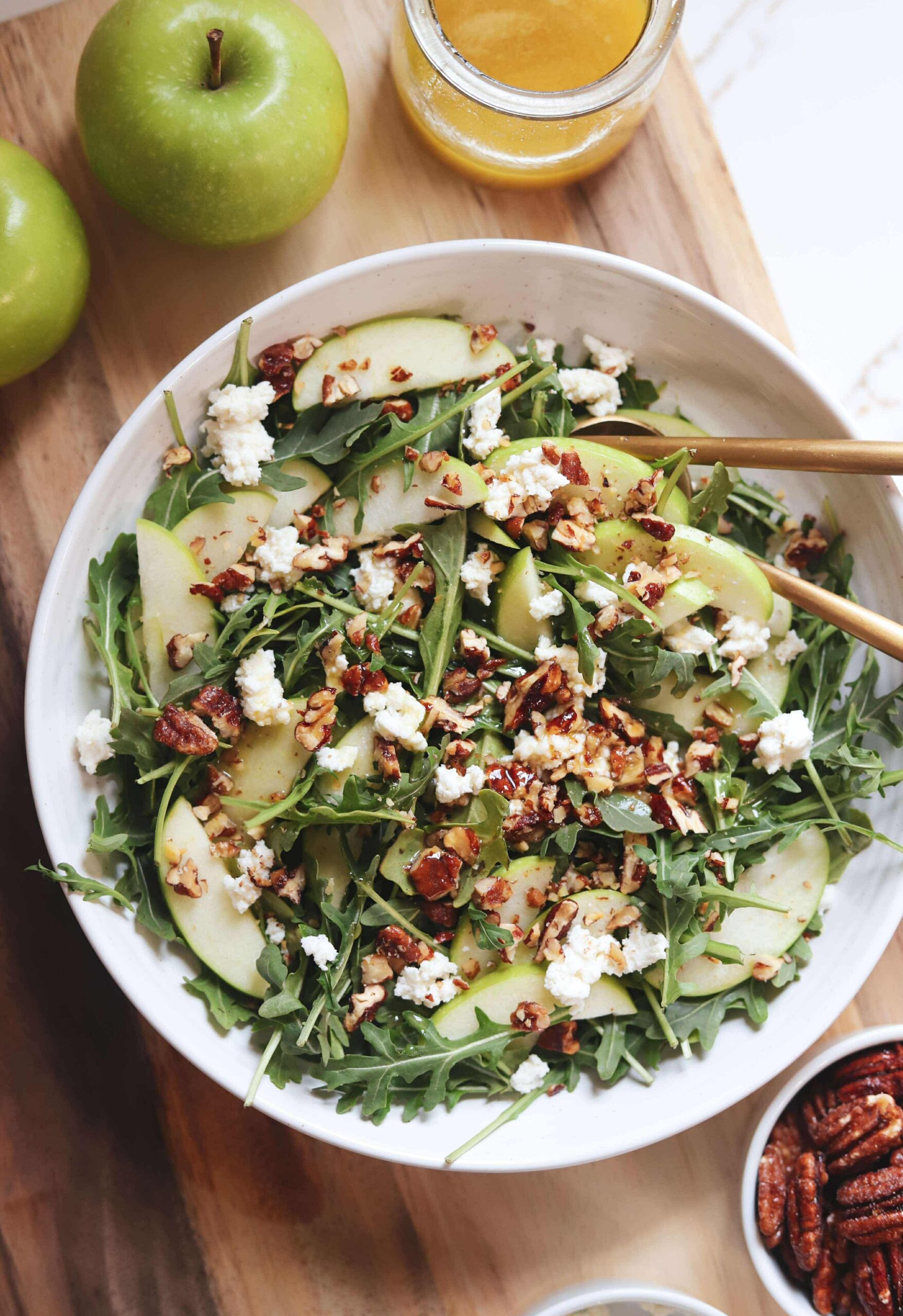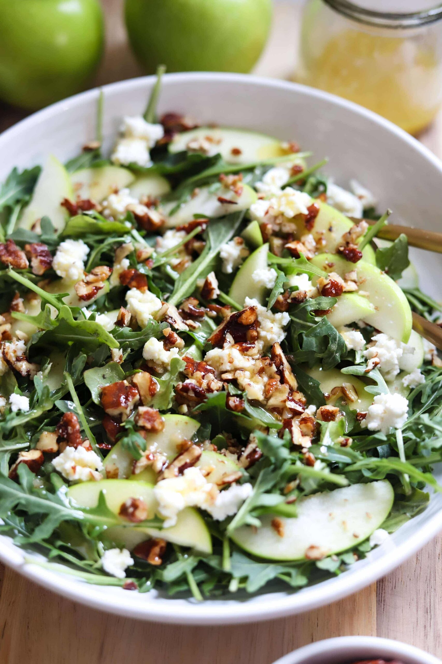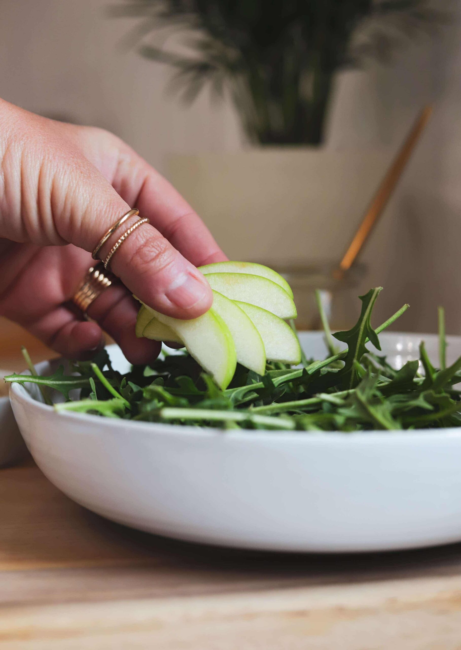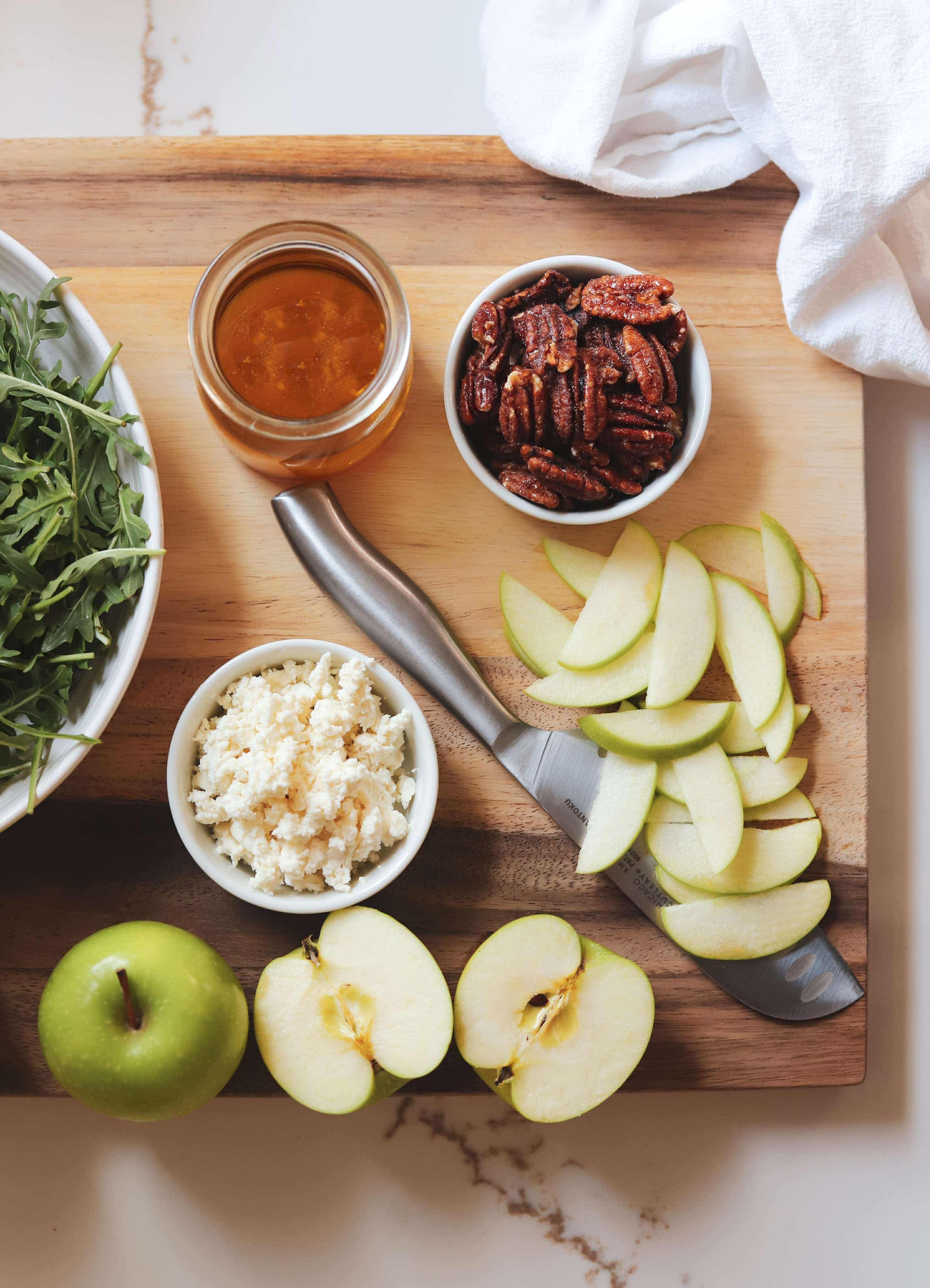 All you’ll need is some baby arugula, granny smith apples, candied pecans and goat cheese… at least for the salad part. Simple ingredients, each with their own huge impact.