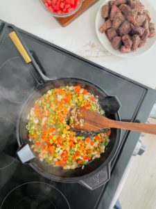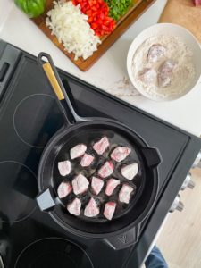 I am using a 12 inch cast iron skillet and it took me 2 batches to brown all of the beef. Cook each piece for about 2 minutes per side. You just want the beef to be lightly seared and browned on all sides. Once it is, transfer it onto a plate and continue repeating the process until all of the beef is browned.