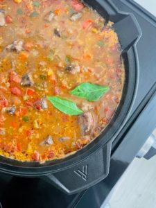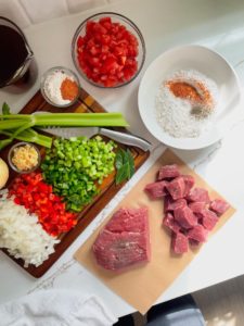 In addition to these beautiful vegetables, you will need a good quality cajun seasoning, some balsamic vinegar, worcestershire, beef broth and bay leaves.