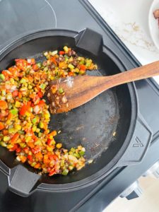 - Add the chopped celery, yellow onion, red and green bell peppers and cook for about 5 minutes