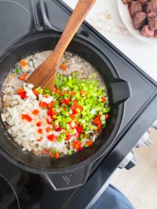 As soon as the garlic has softened and is fragrant, add the diced celery, onions and bell peppers and cook for about 5 minutes.