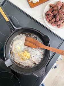 Once all of the beef has been browned and transferred onto a plate, add 2 tablespoons of butter into the skillet along with 4 cloves of finely minced garlic. Cook the garlic for about 60 seconds while stirring and scraping the bottom of the skillet to work up any brown bits left behind from browning the beef.