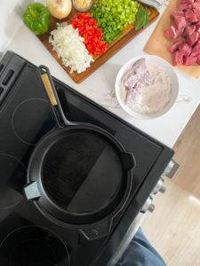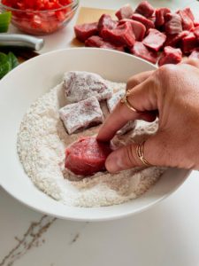 In a small bowl, combine 1/2 cup of all purpose flour with 1 heaping teaspoon of cajun seasoning. Lightly coat all of the beef on all sides and transfer the coated beef onto a plate to rest for a few minutes.