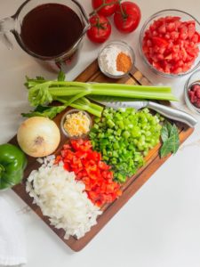 Begin by preparing your ingredients. Grab a sharp knife and dice up 2 celery ribs, a large yellow onion, a small red bell pepper, a small green bell pepper, 4 cloves of garlic and about 2 cups of tomatoes.