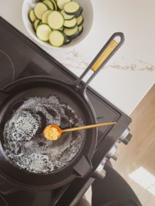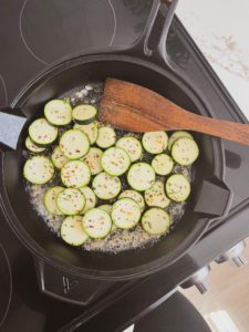 Add a tablespoon of butter into the same skillet along with 2 finely minced cloves of garlic. Cook over medium heat until all of the butter has melted and the garlic is quite fragrant and then add your zucchini.