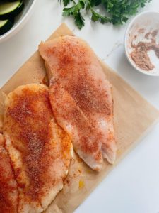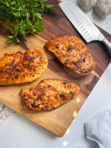 Slice 2 boneless skinless chicken breasts in half horizontally to create 4 thin chicken cutlets. Drizzle the chicken with olive oil on both sides and seasoned generously with your spice blend.