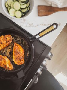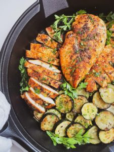 This is one of those weeknight dinners that I make regularly. It is healthy, simple and perfectly balanced between light and filling. Grilled chicken seasoned generously for loads of flavor served with wilted zucchini cooked right in the same skillet. Protein, veggies and only one pan to clean after dinner. What could be better?