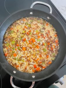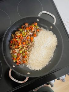 Push everything over to the side of the skillet once again and add your rice. I like to toast the rice for a minute or two before adding the liquid. It will add a nice toasty flavor to the rice.