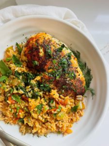 This herb butter chicken and rice is just delicious. It is simple to make, but full of so many beautiful flavors. It is a great way to use fresh herbs you have on hand and it is an easy to recipe to customize for many different cuisines.