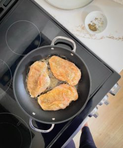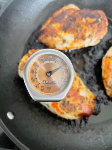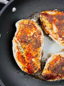 Once the underside of the chicken is golden brown, flip each piece and reduce the heat to medium. Add another tablespoon of butter and cook until the chicken is cooked through with an internal temperature of 165 degrees.